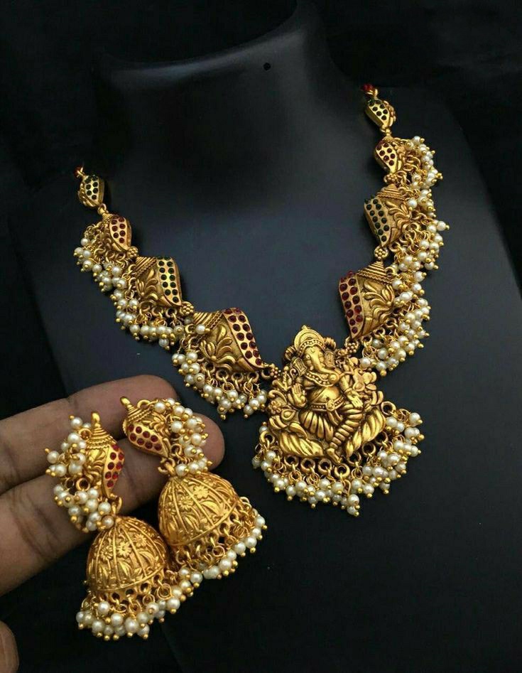 Happy Ganesh chathurdhi!! Celebrate this Ganesh chathurdhi with these beautiful temple jewellery. The necklace is the accessory of the season. Refresh your style with everything from statement styles and pieces featuring tough D-ring detailing. Opt for a bold wide fabric choker and style it out with your go-to bomber jacket, V-neck tee, and skinny jeans for a current off-duty look. Check out these awesome classic golden Temple necklace