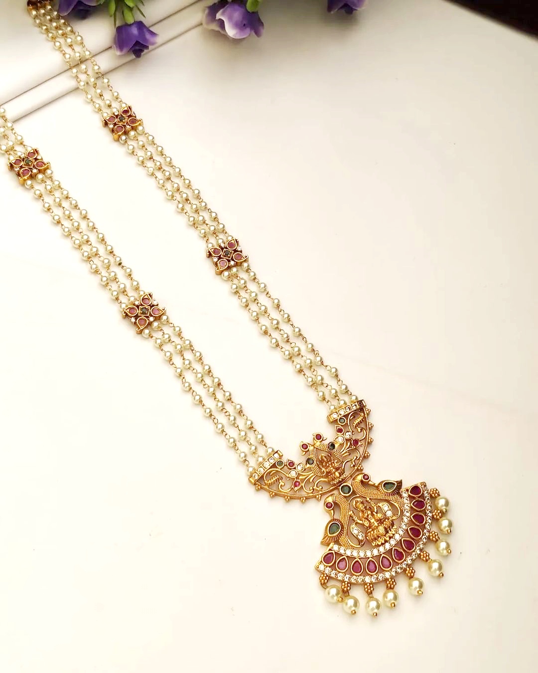 This Pearl necklace designs became very popular recently among Young & middle aged women. These are simple yet elegant for all the occasions, especially for weddings, those who want to look simple & stylish. Although it looks like a uniform pearl design, this is from the family of bib necklace made of multiple strands with Gold, diamond & stones pendants. Check out these latest pearl golden necklace designs!!
