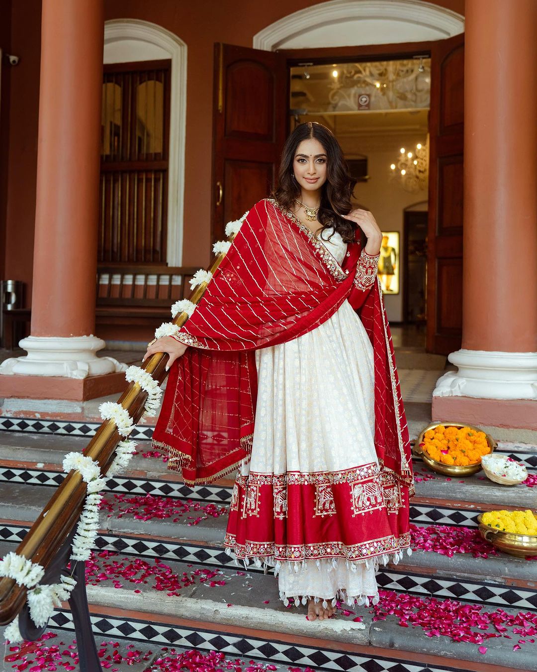 This designer white and red full sleeve anarkali is a stunning piece of clothing. It features heavy mirror work that adds to its beauty, making it perfect for special occasions. The combination of the two colors gives this outfit a unique look that will make you stand out in any crowd. Whether you're attending a wedding or just want to show off your style, this anarkali is sure to turn heads wherever you go!
